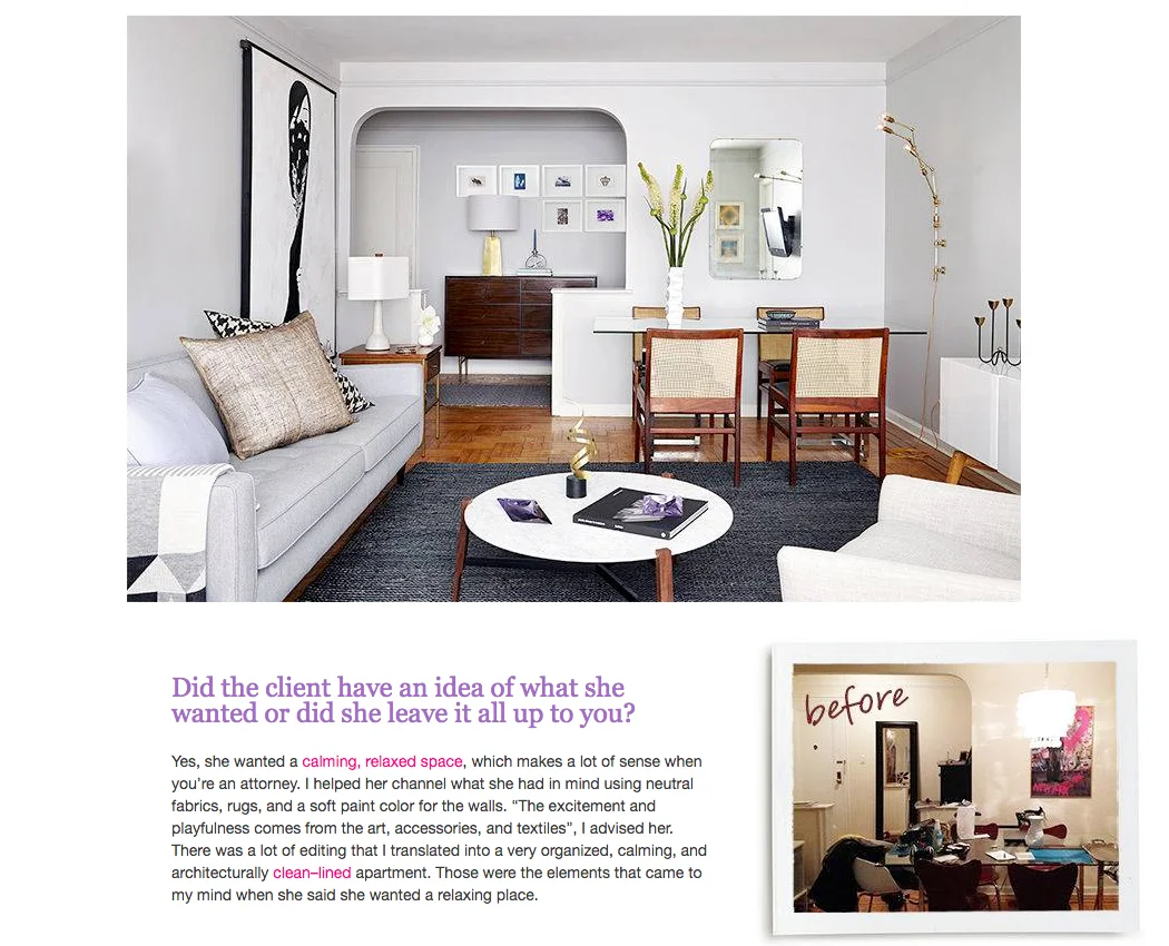 Everything about this project was really fun. Picking out the postcards for the hallway was really fun, they had to fit with the palette of the overall design of the apartment, and she wanted me to pick them out for her, the problem was: I was getting mine too! I remember that my client was very concerned that the 2-tone vintage side chairs in pink / blue were going to look too kooky —almost like a circus—and she sent me a picture of the iconic Nelson Marshmallow sofa with the cushions in different colors. But she was very pleased when she saw how they turned out.What's the best design advice you've ever been given?