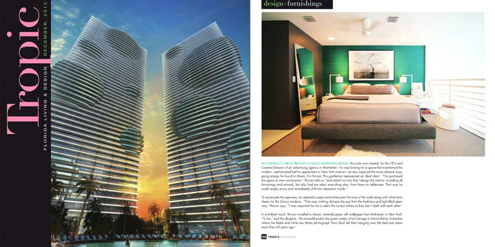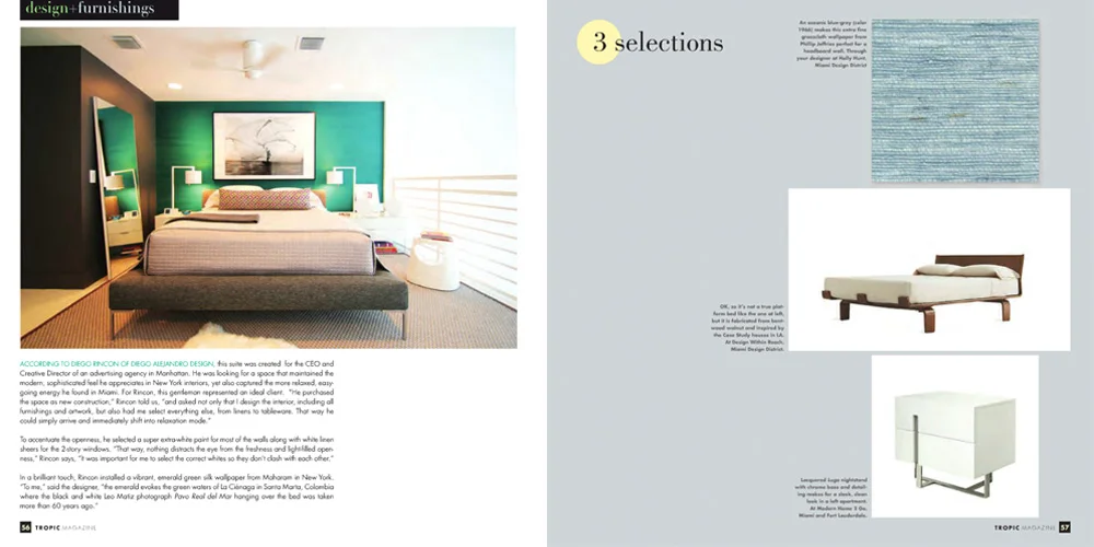 According to Diego Rincon of Diego Alejandro Design, he created this master bedroom suite for the CEO and Creative Director of an advertising agency in Manhattan. He was looking for an interior design that maintained the modern, sophisticated feel he appreciates in New York interiors, yet also captured the more relaxed, easy-going energy he found in Miami. For Rincon, this gentleman represented the ideal client. “He purchased the space as a new construction,” Rincon told us, “and asked not that only that I design the interior, including all furnishing and artwork, but also had me select everything else from linens to tableware. That way he could simply arrive and immediately shift into a relaxation mode.”